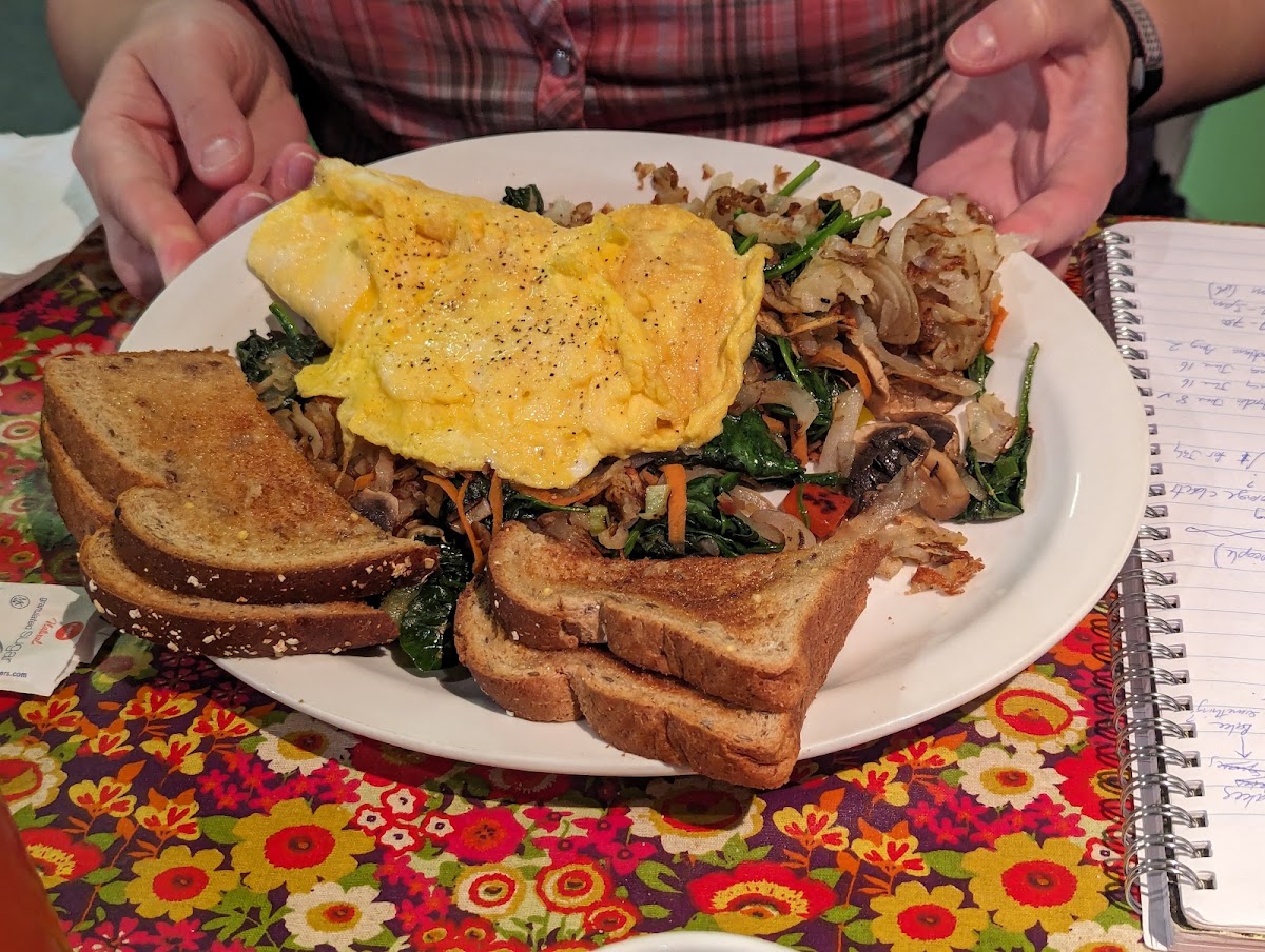 Its a cute small mom & pop type of local restaurant in south Vancouver, the atmosphere is retro type and its in a retro 90s 80s building , has parking lot ,and nearby to bus stops. Its got verity including vegetarian, its more then a breakfast place they also got burgers , soups ,fish and Chips . Indoor seating with tables chairs and booths, little bit outside seating, staff here are good