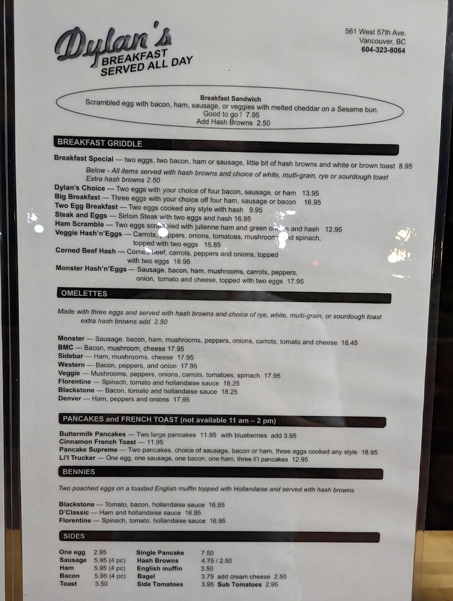 Simple sides like hash browns, toast, or sausages complement the main dishes, allowing for customizable plates that suit different tastes and appetites. All in all, Dylan’s menu is about comfort and ease, making each visit feel like a gentle pause in the day.